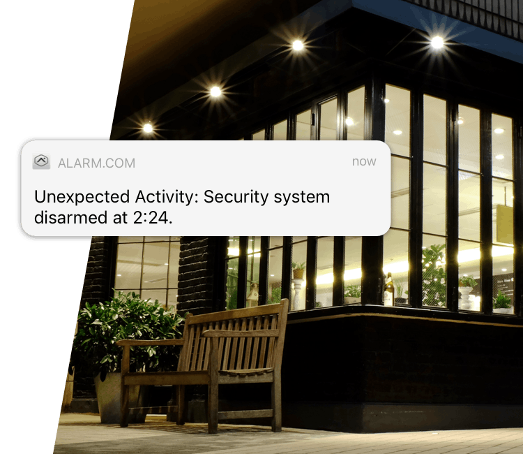 Alarm.com’s machine learning algorithm monitors your day to day operations and identifies unusual activity. Set up an unexpected activity alert so you’re the first to know when something out of the ordinary happens.