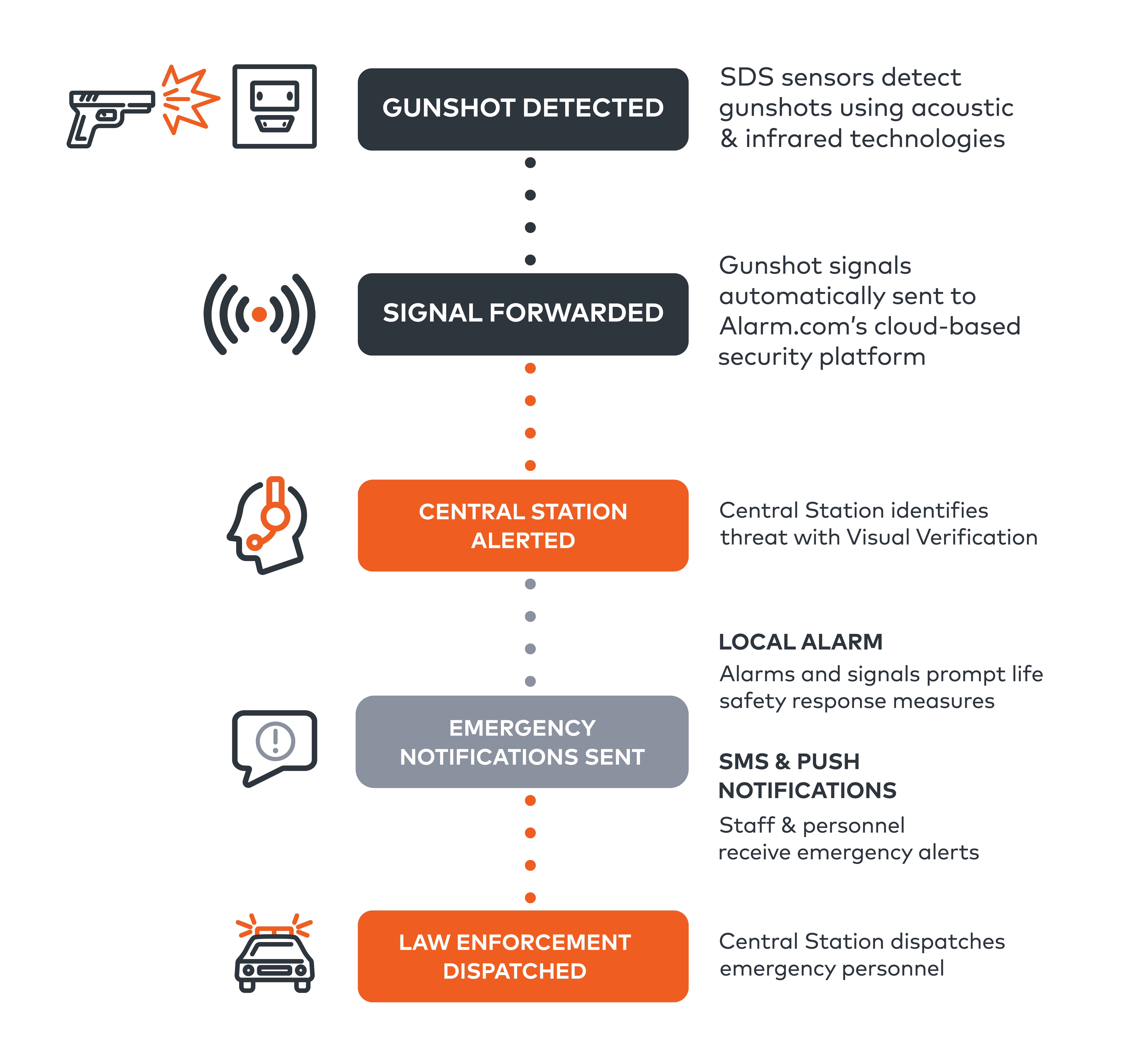 When a gunshot is detected, the signal is automatically sent to Alarm.com’s cloud-based security platform. This allows for two processes: (1) Alerting the central station and enabling identification through visual verification, and (2) sending emergency notifications via local alarms and SMS and push alerts.